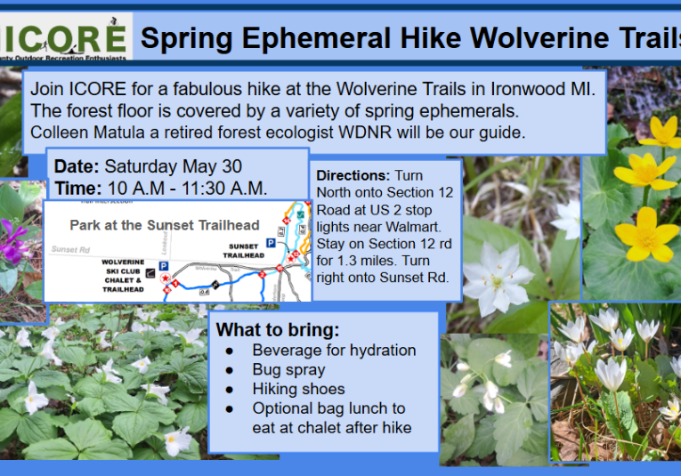 The Iron County Outdoor Recreation Enthusiasts (ICORE) are a group of silent sports enthusiasts promoting the responsible use of land and water open to the public for the enjoyment of all, with the following goals: